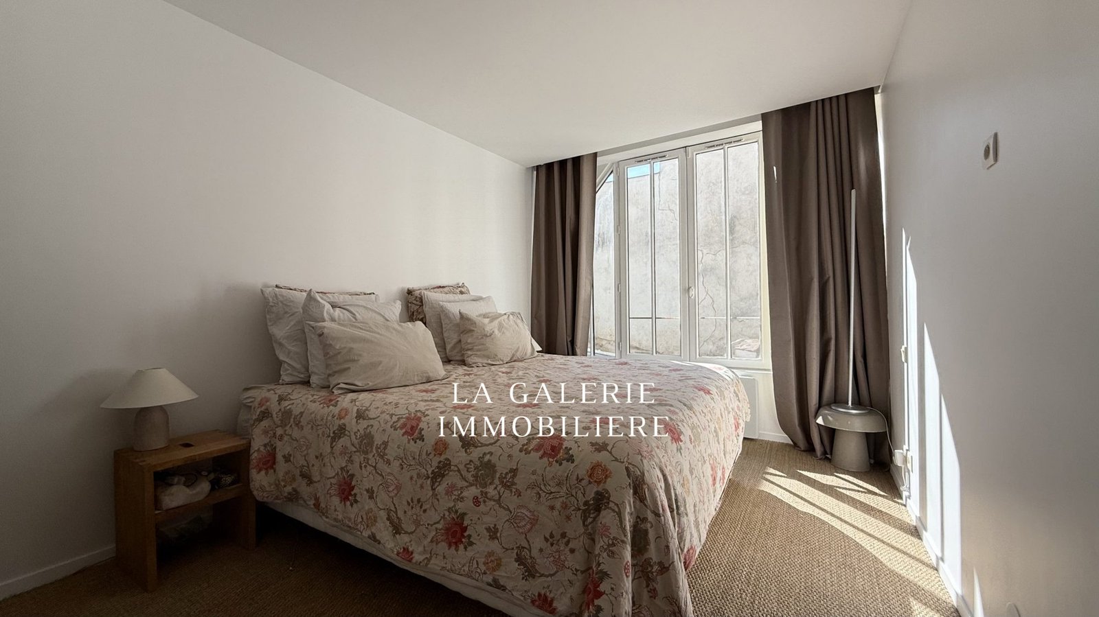 La chambre principale avec de grandes baies vitrées, donnant sur une cour pavée au calme, dispose de sa salle de bains attenante et offre un environnement reposant.