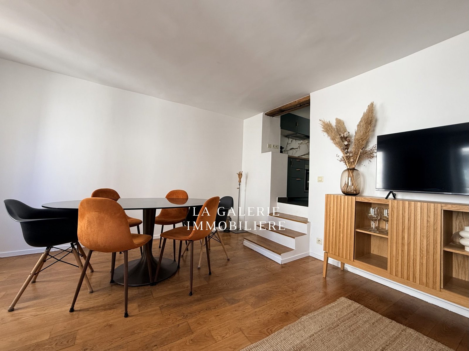 À l’extrémité du séjour, quelques marches mènent à une cuisine entièrement aménagée et équipée, compacte et pratique au quotidien. Un couloir dessert des rangements intégrés ainsi que des toilettes indépendantes.